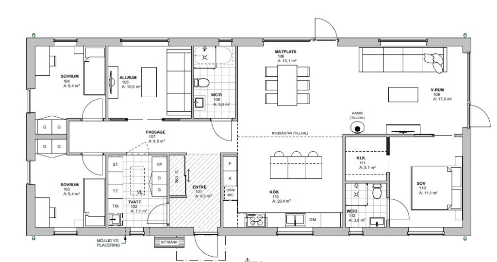 Det vinkelbyggda vardagsrummet utnyttjar husets ytor på ett effektivt sätt och bjuder in till umgänge och sociala stunder. Här finns gott om plats för både familj och vänner. Väljer du till ryggåstak skapas extra takhöjd, ljus och en härlig känsla av rymd.